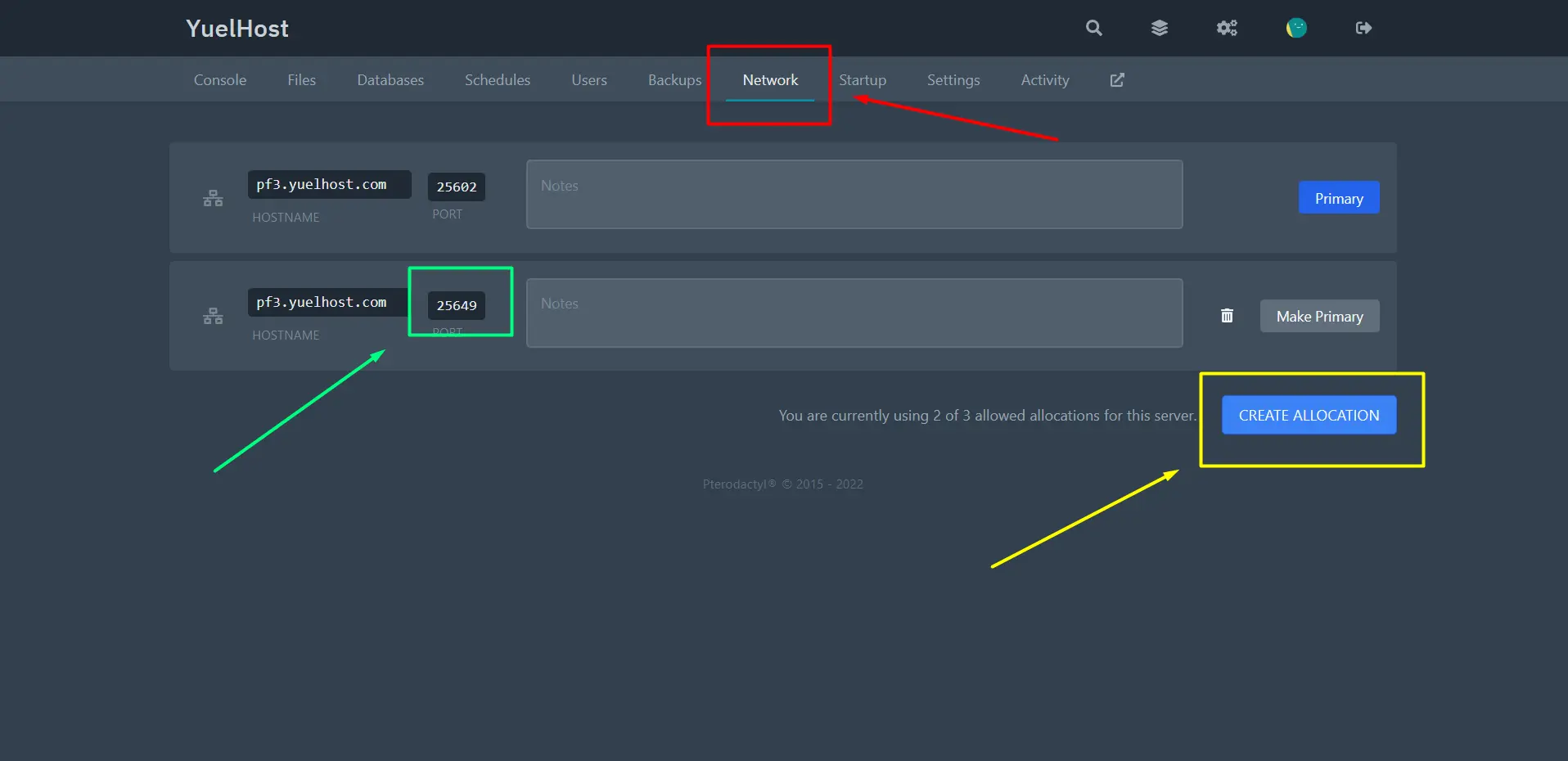 Setelah proses restart selesai, buat alokasi baru di bagian 'Network Tab' dan salin nomor portnya.