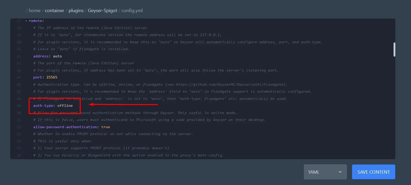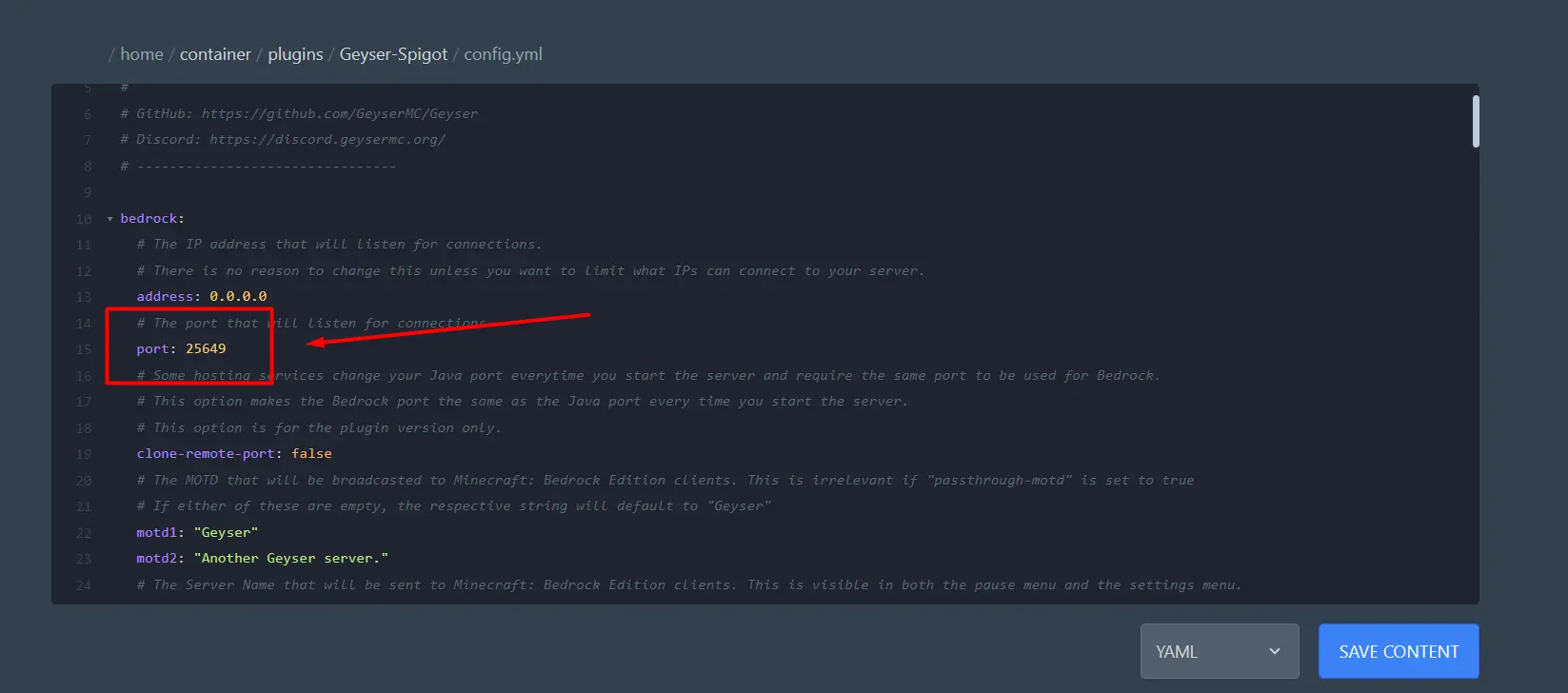 Setelah membuat alokasi baru dan mencatat nomor portnya, akses 'file manager' > folder 'plugins' > folder 'geyser', dan edit file 'config.yml'. Gantilah port sesuai dengan yang telah dicatat tadi