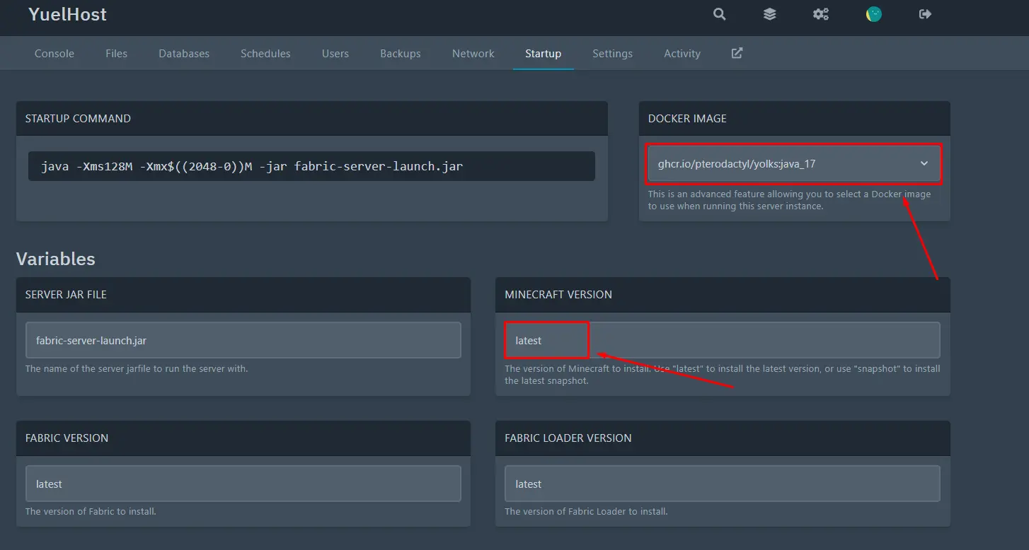 Kalian bisa mengubah versi server di server > startup > Minecraft Version. Bisa kalian ubah dari 'latest' menjadi 'versi' contoh di RLCraft menggunakan versi '1.12.2' kalian bisa merubah dari 'latest' menjadi '1.12.2'. Dan jangan lupa ubah Docker Images jika menggunakan 1.8+ menggunakan Java 8, Jika 1.17+ menggunakan Java 17