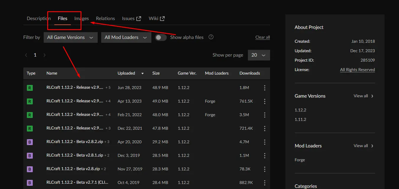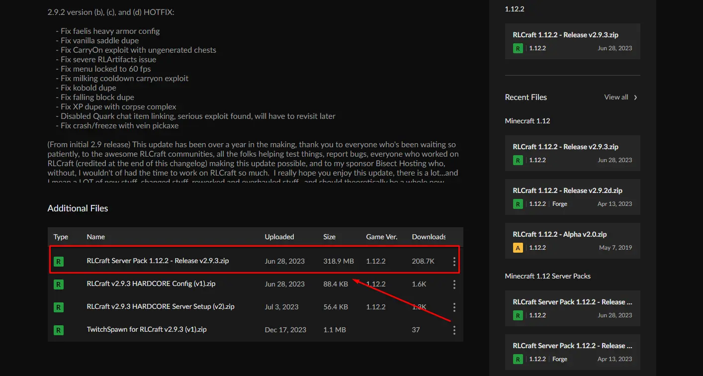 Kalian harus mengunduh modpack yang kalian inginkan contoh Modpack RLCraft. Pastikkan kalian sudah menghapus semua data di server kalian sebelum mengganti atau menambahkan modpack. Kalian bisa membackupnya jika ingin kembali sewaktu waktuPergi Ke Files Tab