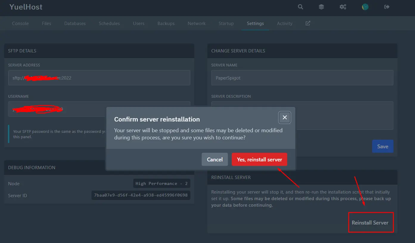 Karena kalian habis merubah versi server kalian tentunya membutuhkan reinstall untuk mengunduh versi yang diinginkan, kalian bisa ke Server > Settings > Reinstall